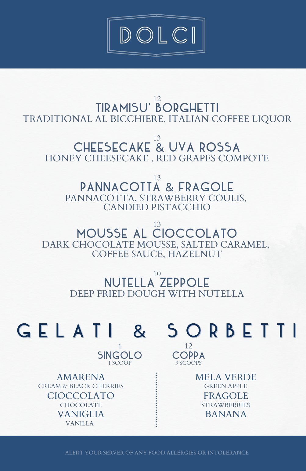 Our Award Winning Wine List has over 100 Italian Wines and Bubbles in addition to a collection of World Spirits and Liquors, A Mixologist crafted Cocktail list and Imported and Domestic Beers.